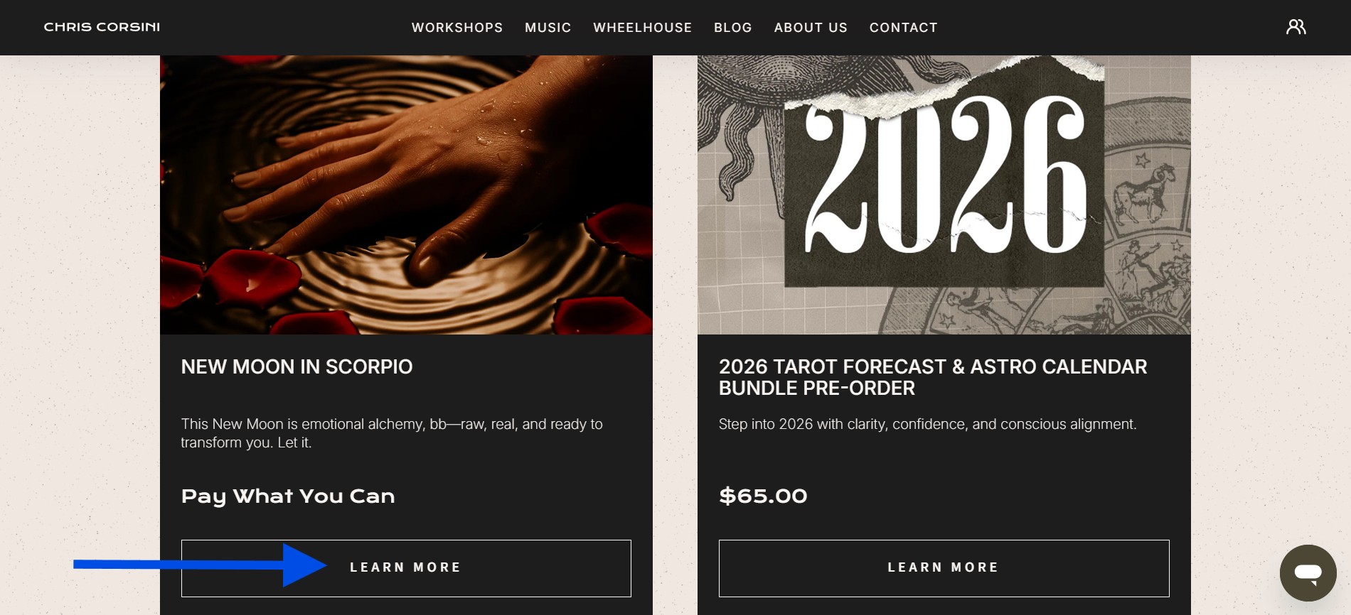 Browse the available donation-based workshops (e.g., Full Moon & New Moon Workshops).