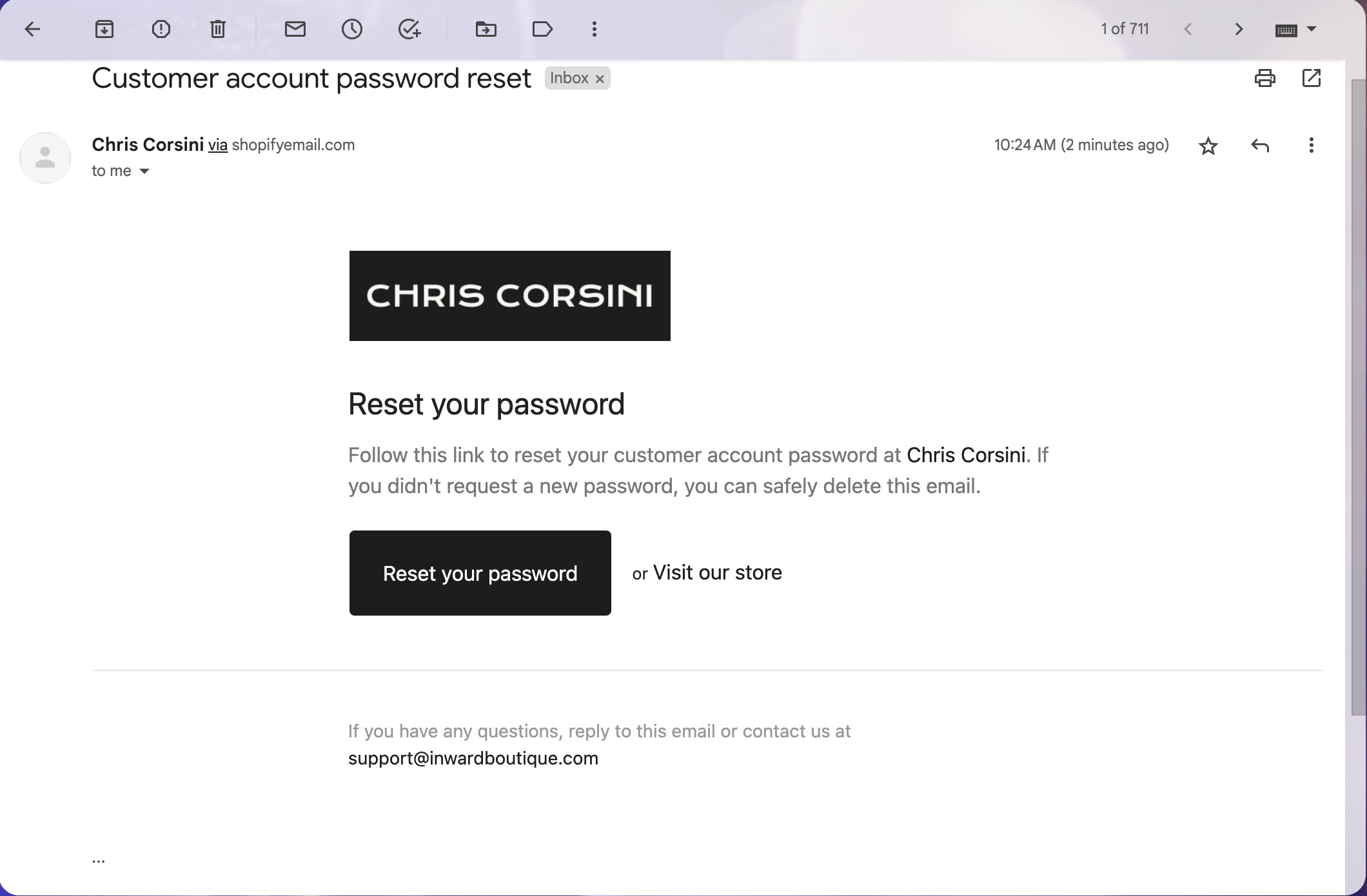 5. Check your email inbox and look for an email from us titled "Customer account password reset" from support@inwardboutique.com