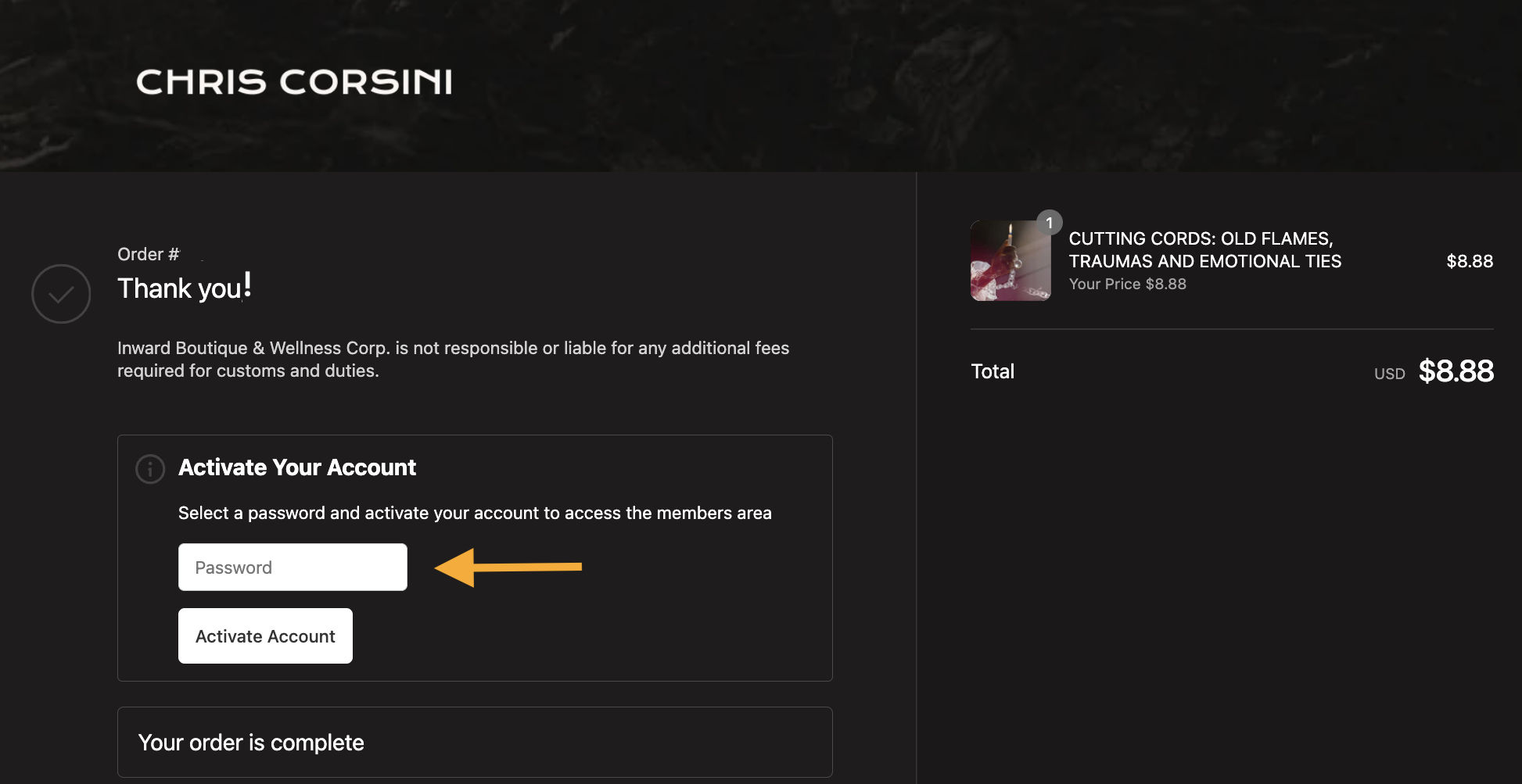 For instance, once you check out and complete a transaction for one of our digital workshops, you may be prompted to Activate Your Account by selecting a password to access your member's area. Please see example below: